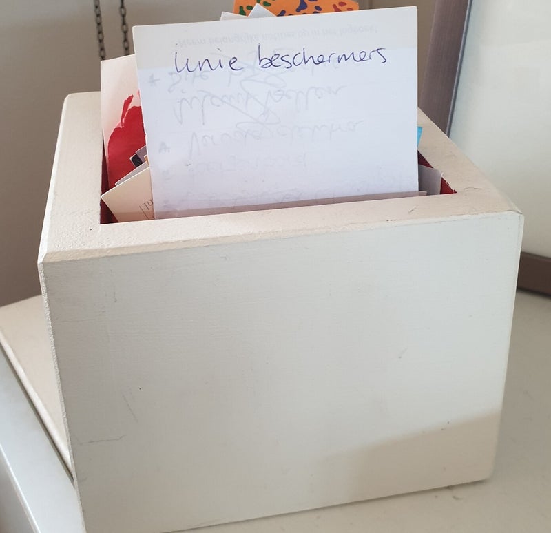 Ik was 7 jaar en ik wilde graag zelf iets maken voor moederdag. Mijn (klus)papa nam me mee naar de schuur die hij had omgetoverd tot werkplaats. Na berading hadden we besloten dat het een juwelen kistje zou worden. Papa bewaarde altijd mooie stukjes hout en planken voor je weet maar nooit. Zo koos ik een hardhouten plank uit en 2 hele mooie sierlijke knopjes voor aan de zijkant. We zaagde de plankjes op maat en ik zou de plankjes mooi glad schuren. Papa dacht dat ik het na een aantal minuten wel zat zou zijn, echter na een paar uur was ik nog niet tevreden en ging gestaag door tot ik wel tevreden was. Met mooie messing spijkertjes en lijm hebben we het kistje in elkaar gezet. Met een messing pianoscharniertje de deksel gemonteerd. Toen mooi beitsen en aflakken. Na een paar dagen was het kistje klaar.
