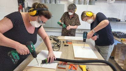 DAG 6 Meubelmaken: je leert afmeten en aftekenen, zagen met een decoupeerzaag en een afkortzaag, hoe maak je een meubel van bijvoorbeeld steigerhout. We gaan planken op maat zagen voor een meubel, voorboren en verzinken, moderne houtverbindingen maken met torx schroeven, schroeven met de accuschroefmachine, werken met houtklemmen.