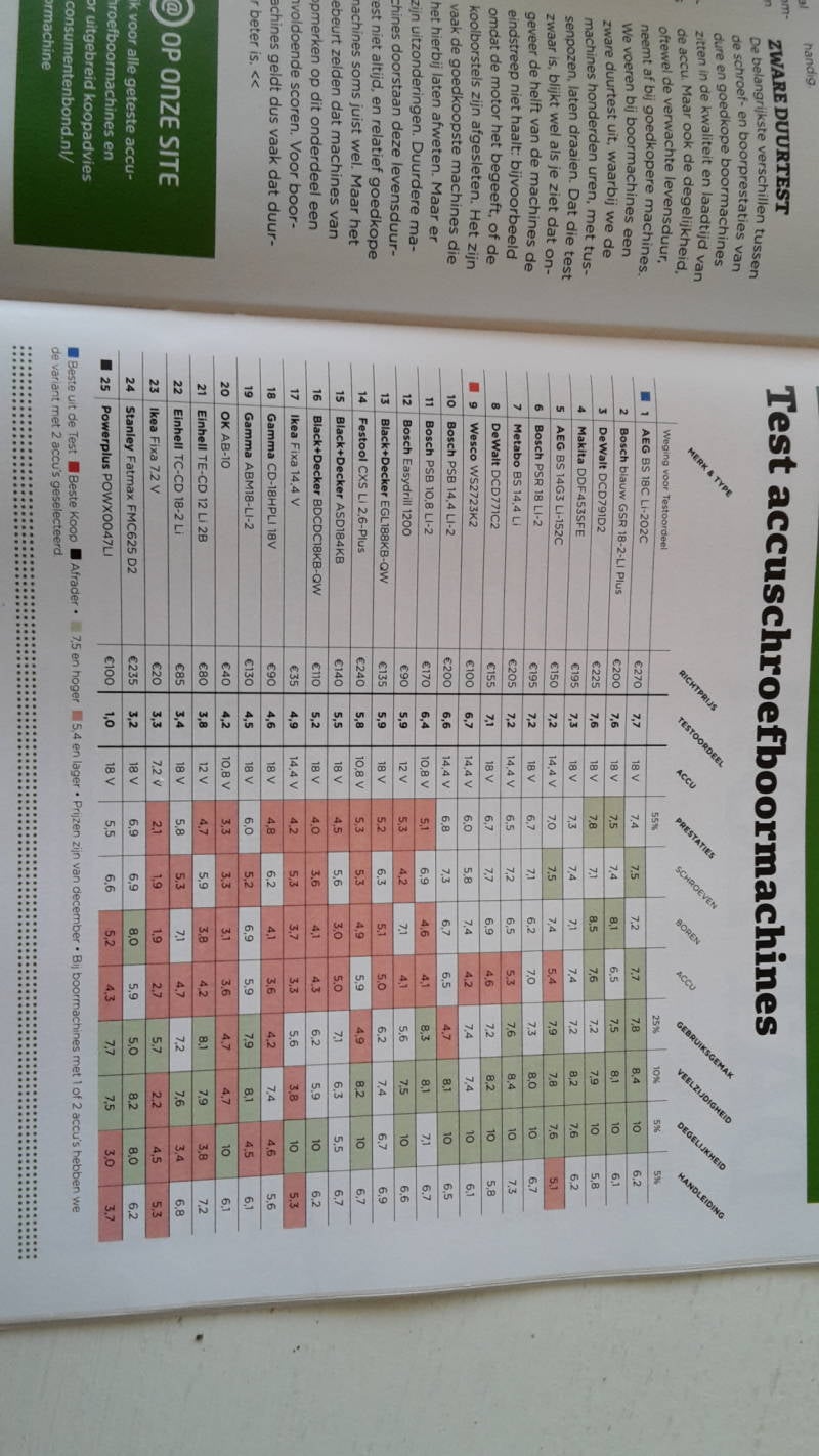 Wil je een schroefboormachine aanschaffen? Kijk eerst even naar de test van de Consumentenbond. Ik zelf ben nog altijd heel blij met Makita, maar let op, hou het type goed in de gaten want Makita is aan het stunten met hun machines in bouwmarkten zoals Karwei en Gamma. Bijvoorbeeld met een uitgebreide koffer en inhoud voor niet heel veel geld. Deze zou ik je afraden. De accu is duidelijk van mindere kwaliteit. Het is van belang dat het opladen van je accu niet te lang duurt. Het liefst een oplaadduur binnen 3 kwartier.